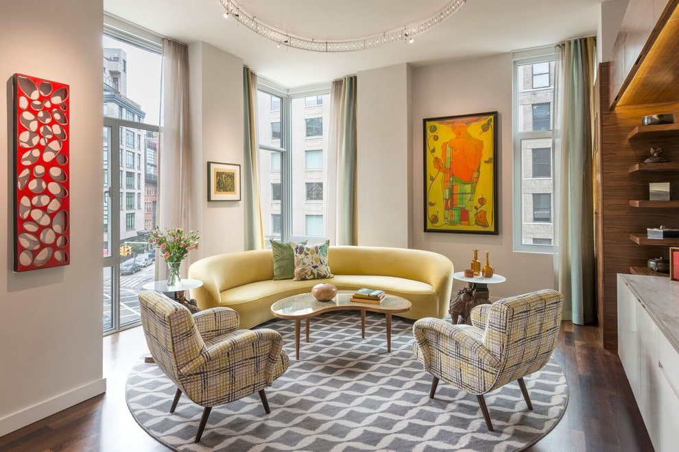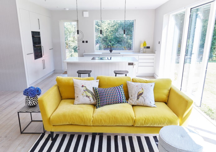In a classic style, an elegant dark yellow, sandy sofa or models in sophisticated and muted mustard, saffron and brown-yellow tones will dilute the strict atmosphere. For modern design, products in bright and pure lemon, canary or honey colors are especially appropriate, in the style of minimalism, furniture in a yellow shade will become a bold transition to the color of the interior and add more interest and style to the space.