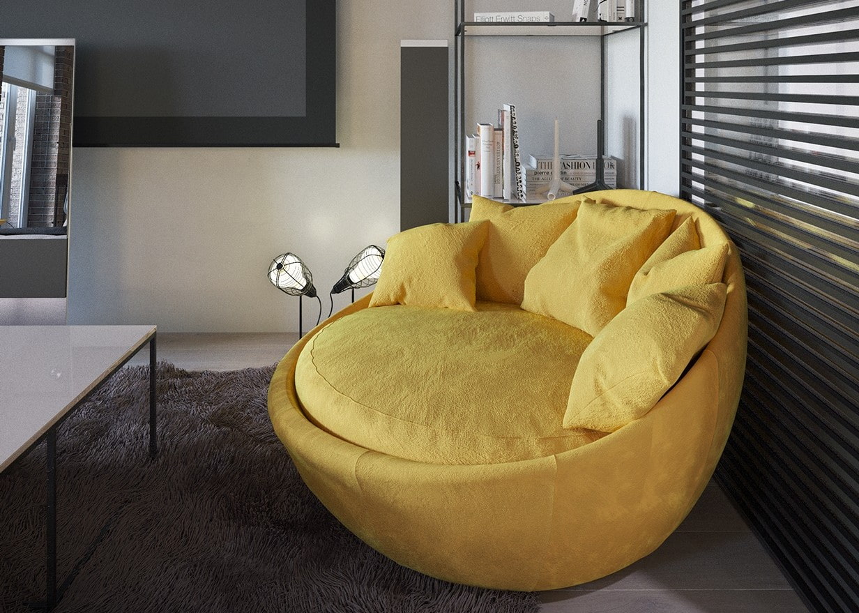In modern interiors, models with yellow upholstery, decorated with various patterns, photo prints, striped patterns, geometric checks or small specks, are often found, which undoubtedly become an undeniable eye-catching accent.