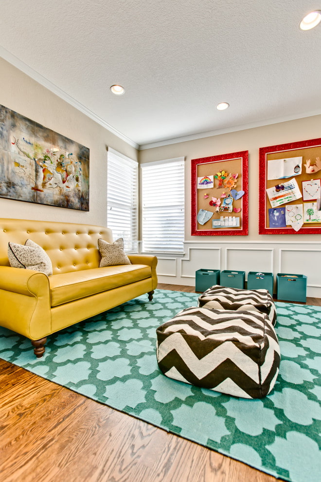 Such a colorful piece of upholstered furniture can complement the design of a nursery for a boy or girl's child and become a bold statement of individual style in a teenager's room.The yellow sofa upholstery can be plain or embellished with geometric patterns and striped prints.