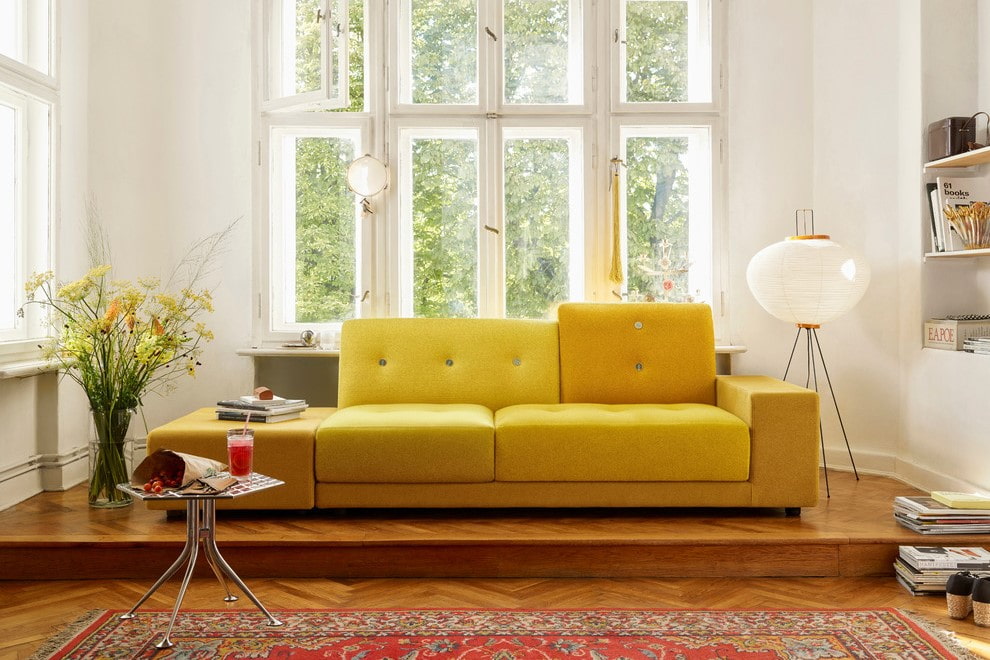 In the photo there is a living room with a straight yellow sofa on black legs.
