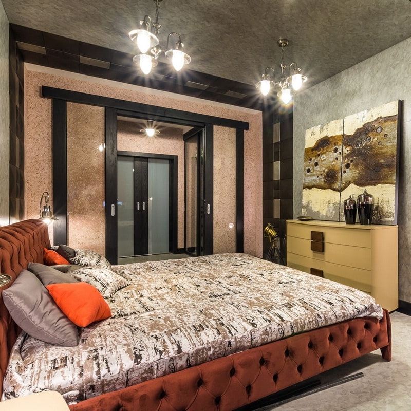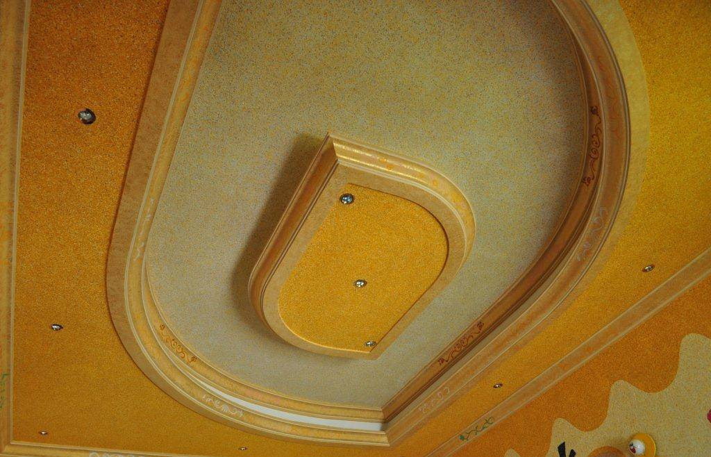 In this room you can rest your body and soul. Liquid wallpaper is perfect for this room, as it is hypoallergenic and does not collect dust. And let this ceiling not become a strong departure from the rules and will make the usual more modern.