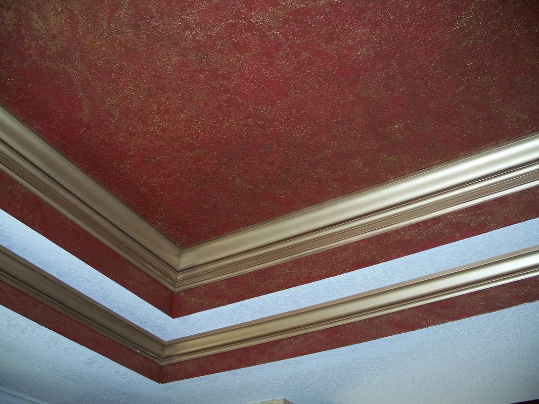 Pictured is a living room with blue liquid wallpaper on the ceiling.