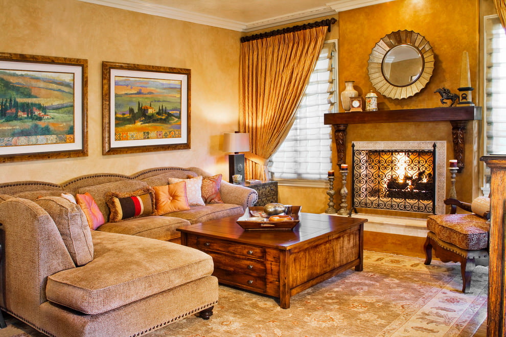 Gold curtains in the living room create a festive atmosphere. Suitable for modern and classic style, depending on which they can be decorated with a soft lambrequin, grabs or contrasting inserts. Double-sided curtains with gold from the inside will be appropriate here, which will show through when draping with clips.
