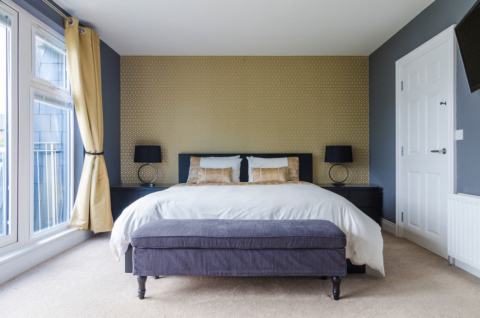 On the picture a contemporary-style bedroom where gold curtains with a thin garter echo in color with an accent wall.