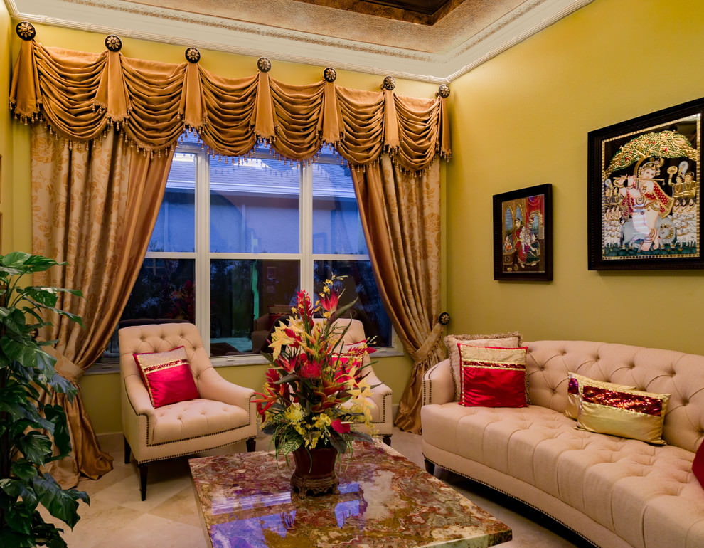 Gold is easier than others to combine with complementary colors for a better feel. It works best with deep and rich colors. Companion color can be in strings, grabs, edging, lambrequin. It can also be curtains with a color transition effect, or a combination of tulle color with curtains.