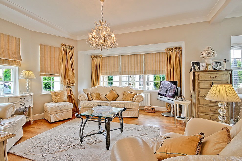 For the bedroom, flowing light fabrics with a moderate use of gold are suitable. Golden tulle will be combined with pastel curtains, ribbons, fringes and ruffles. Also, French or Roman curtains will be appropriate here.