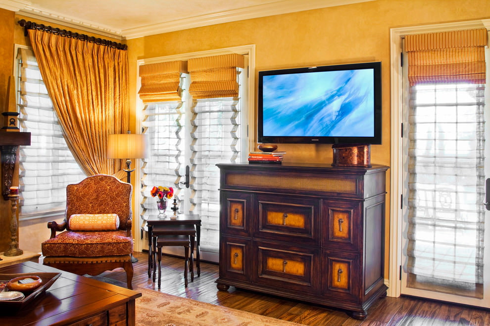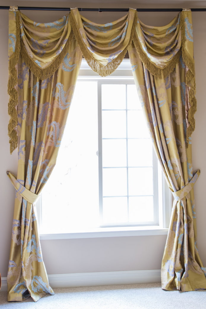 When creating an interior in a classic style, noble fabrics of different golden shades are most often used for curtains. Fringe, tassels and lambrequin are perfect complements. Here, gold is ideally combined with burgundy, black and brown. Patterns and small monograms on curtains are appropriate.