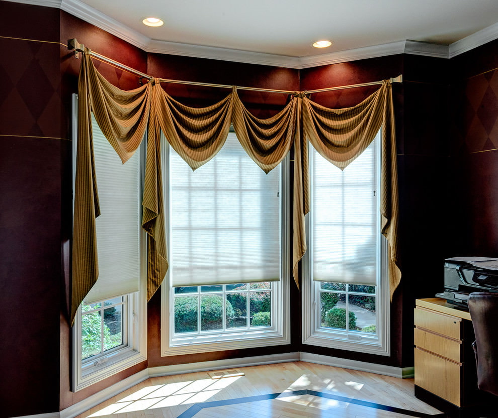 On the picture an example of decorating a window with perekidami (svagi) made of velvet fabric in the interior of a burgundy room.