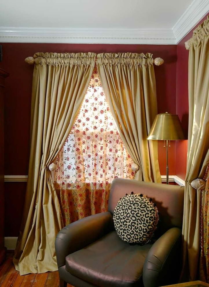 Gives a solemnity to the room, this color combination of curtains is suitable for the hall, reception rooms and offices. Burgundy and gold brocade or velvet curtains create an atmosphere of royal luxury.