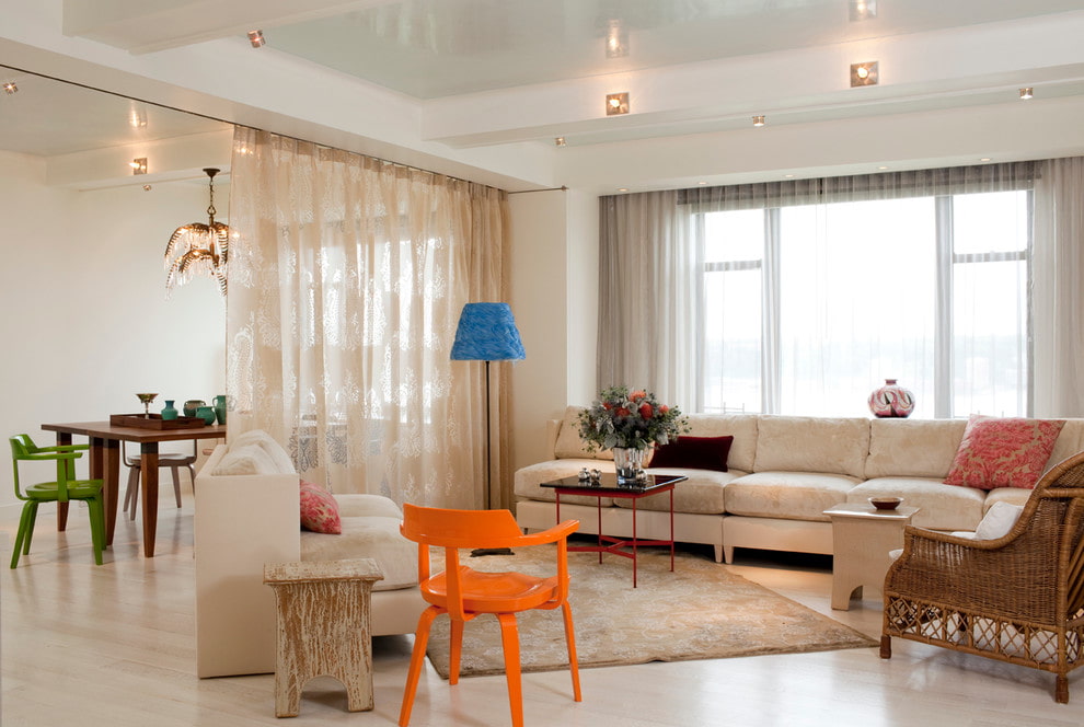 Translucent curtains to the ceiling are especially suitable for zoning a small room. They are able to adjust the space, add volume and a feeling of lightness to it.