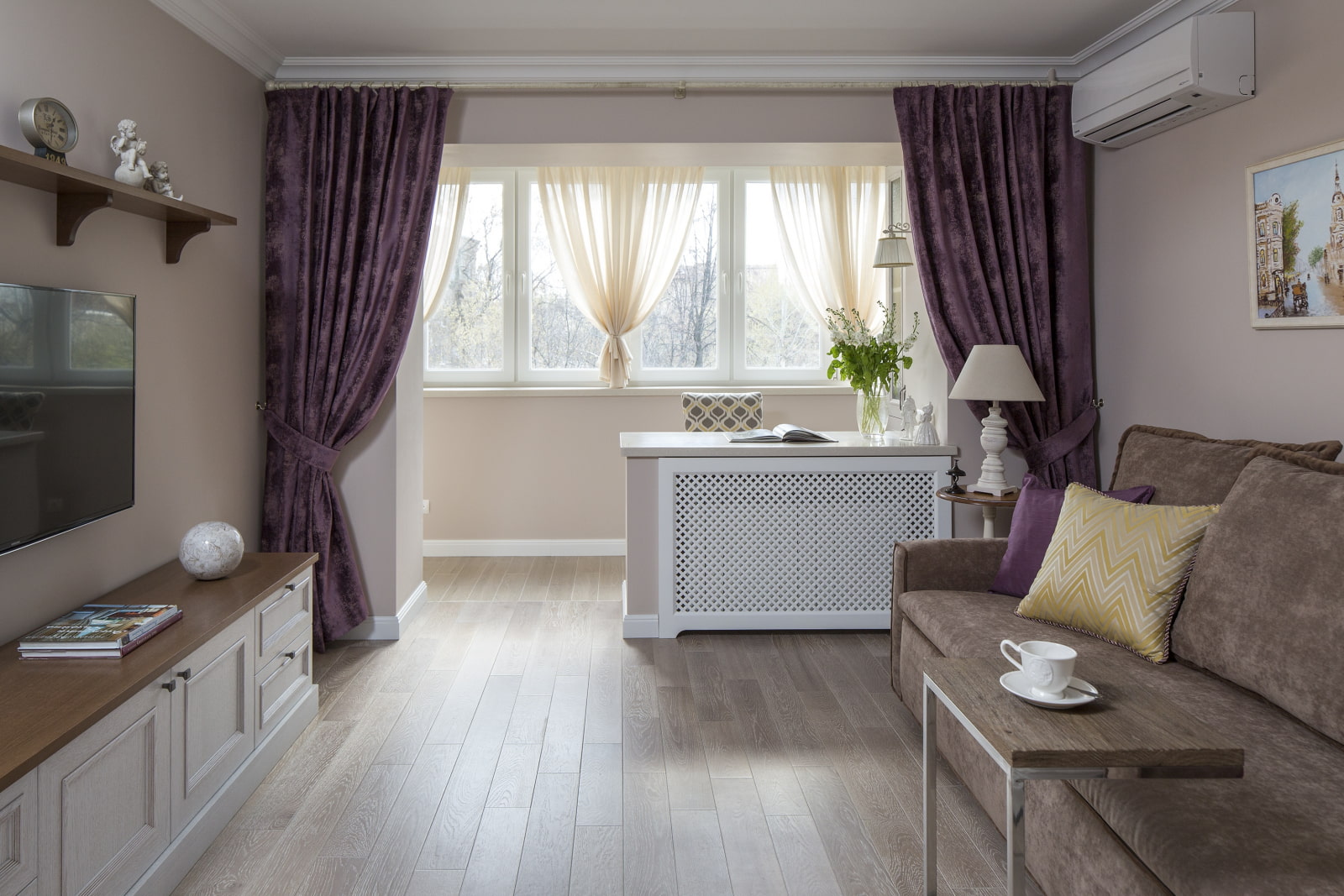 In rooms combined with a balcony, various curtains are also used for zoning. Thus, it is possible to form two zones, decorated in an identical or different style, for example a living room and an office or a bedroom and a sitting area.