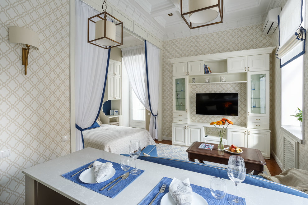 Competent division of a one-room apartment contributes to the creation of a comfortable interior.