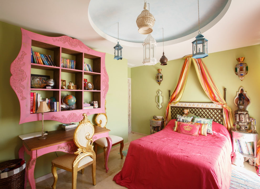 The photo shows the design of a small room for a teenage girl, decorated in oriental style.