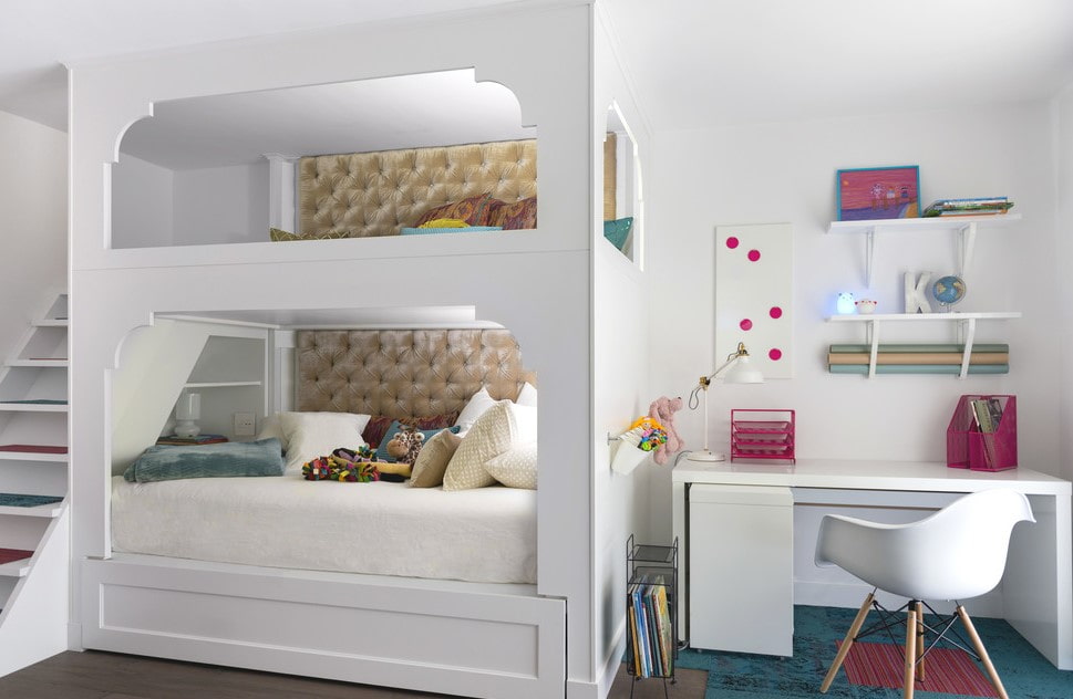 Each of the sisters should have their own area with a work area and a dressing room for storing things. Thus, girls will feel more comfortable and have a sense of personal space, since one daughter can still play with dolls, while the other is interested in more adult hobbies.
