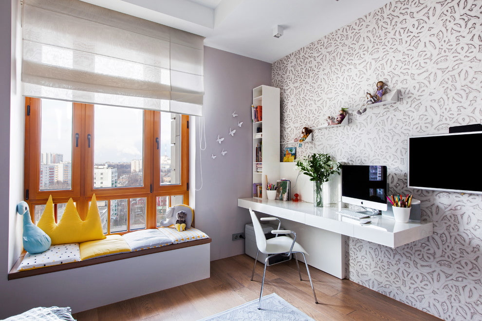 It is also perfect to complement the atmosphere with the help of an original hanging chair, hammock, ottomans, floor pillows, or even exercise equipment and a wall bar for active teenage girls. In the presence of a wide and low window sill, it is often converted into a comfortable sofa.