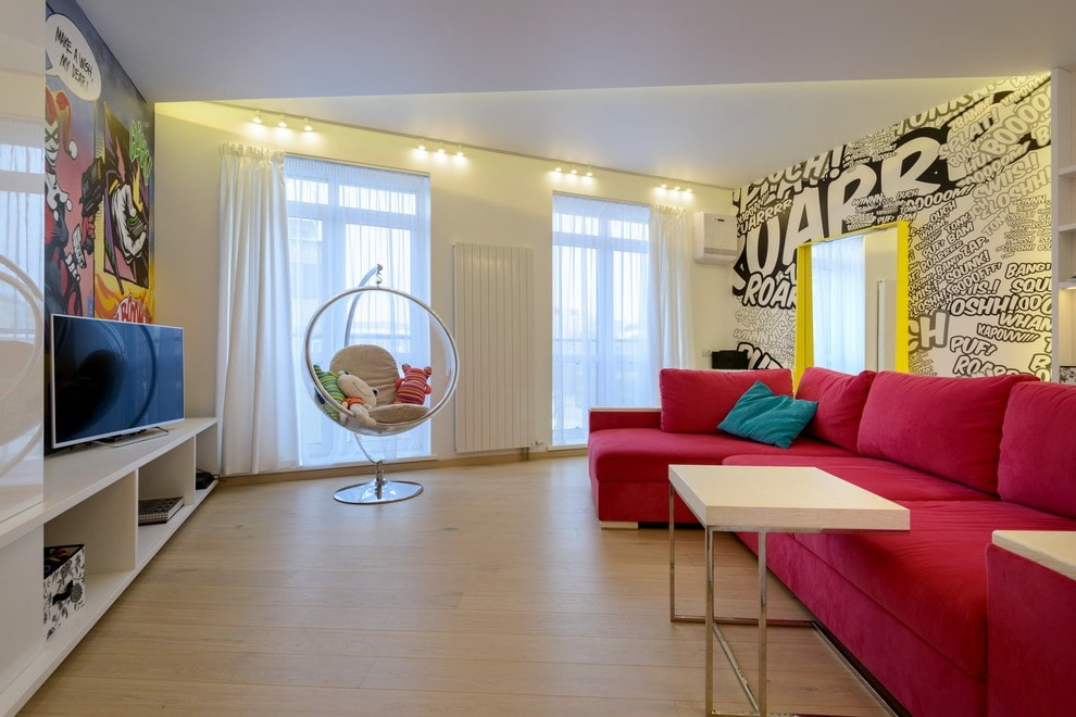 The spacious room can accommodate a separate area for relaxation and reception of friends, equipped with a sofa, armchairs or frameless ottomans.