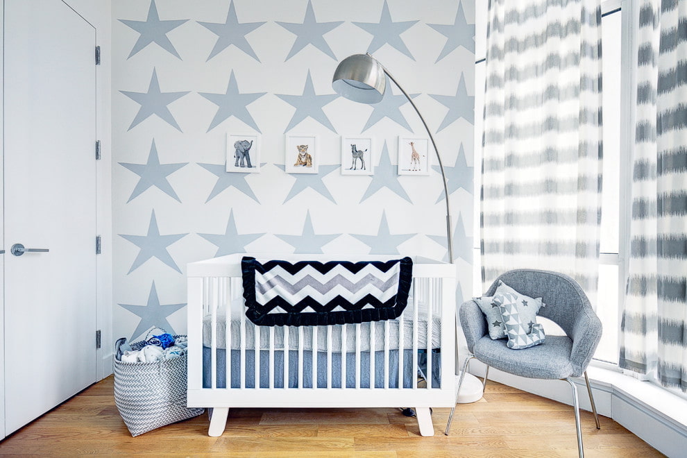 In the photo, the walls are covered with wallpaper with pictures of stars in the interior of the bedroom for the baby.