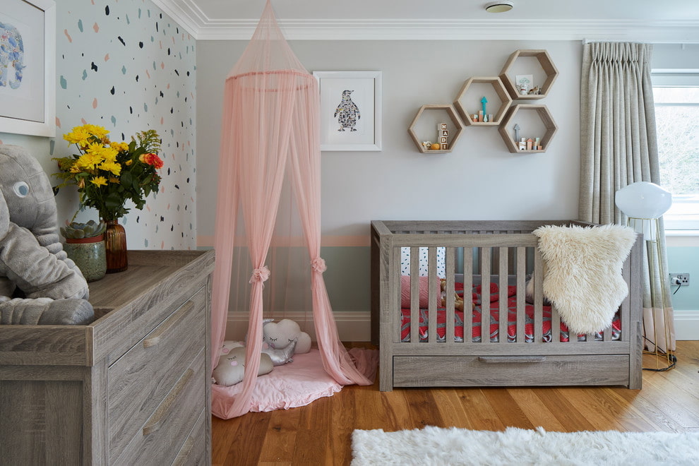 You can add magic to the atmosphere with the help of an elegant canopy or an interesting mobile with light clouds, butterflies or flowers.
