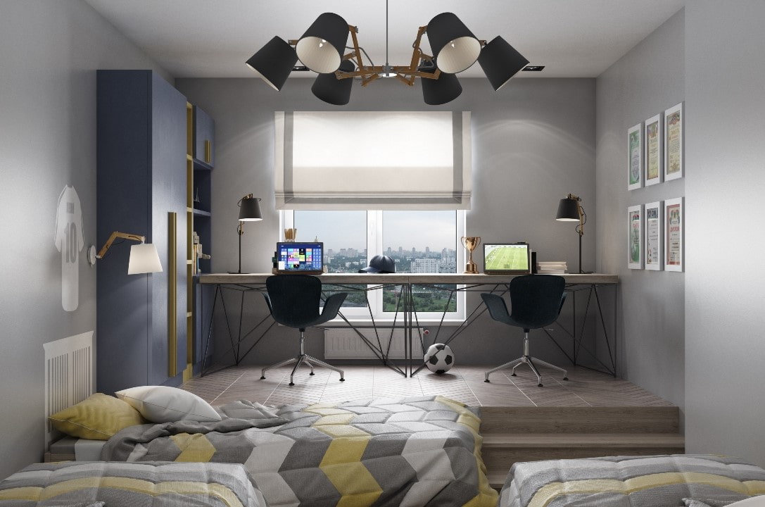 A more convenient solution is multifunctional sectional furniture, which can be easily positioned between the beds and visually highlight the child's personal space.In the bedroom, it is appropriate to use transforming furniture in the form of folding tables or a wide window sill integrated into the table top.