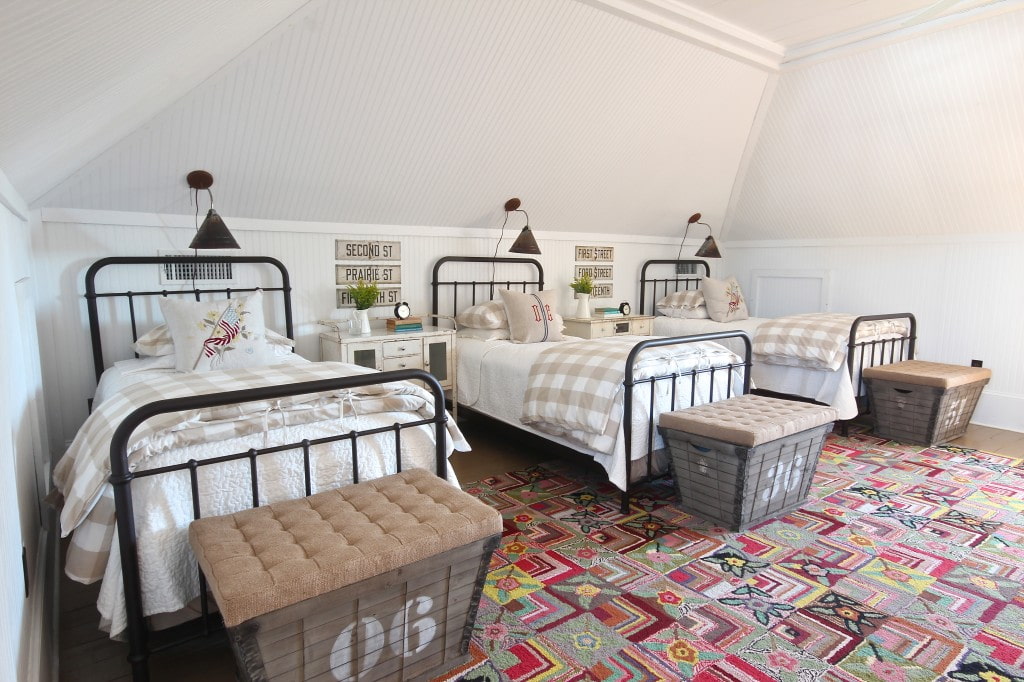 The most important and obligatory element of a nursery for three is a bed. For a small room, you can use a three-tier model or a bunk structure with a roll-out bed, if there is enough space in one room, it is preferable to install three separate single beds, sofas or couches with U-shaped, L-shaped, parallel or linear placement.