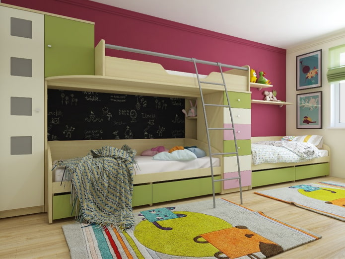 In a bedroom for three children of different sexes, zoning with screens, curtains or plasterboard partitions will be appropriate, which can be used to separate a place for changing clothes. When decorating a room, age characteristics are primarily taken into account. In the nursery for small children, it is possible to install full beds next to each other and highlight their bodies in a certain color.