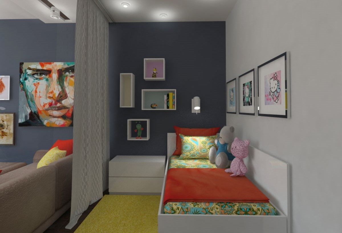 Another way to zone a nursery is to use different colors or textures. A small room in a Khrushchev building is usually narrow and resembles a trailer. Having painted its halves in contrasting colors, you can divide the room into two squares at no special cost. One part should be reserved for study and storage of things, and the other for rest. A carpet laid on the floor in one zone partially copes with the same function.
