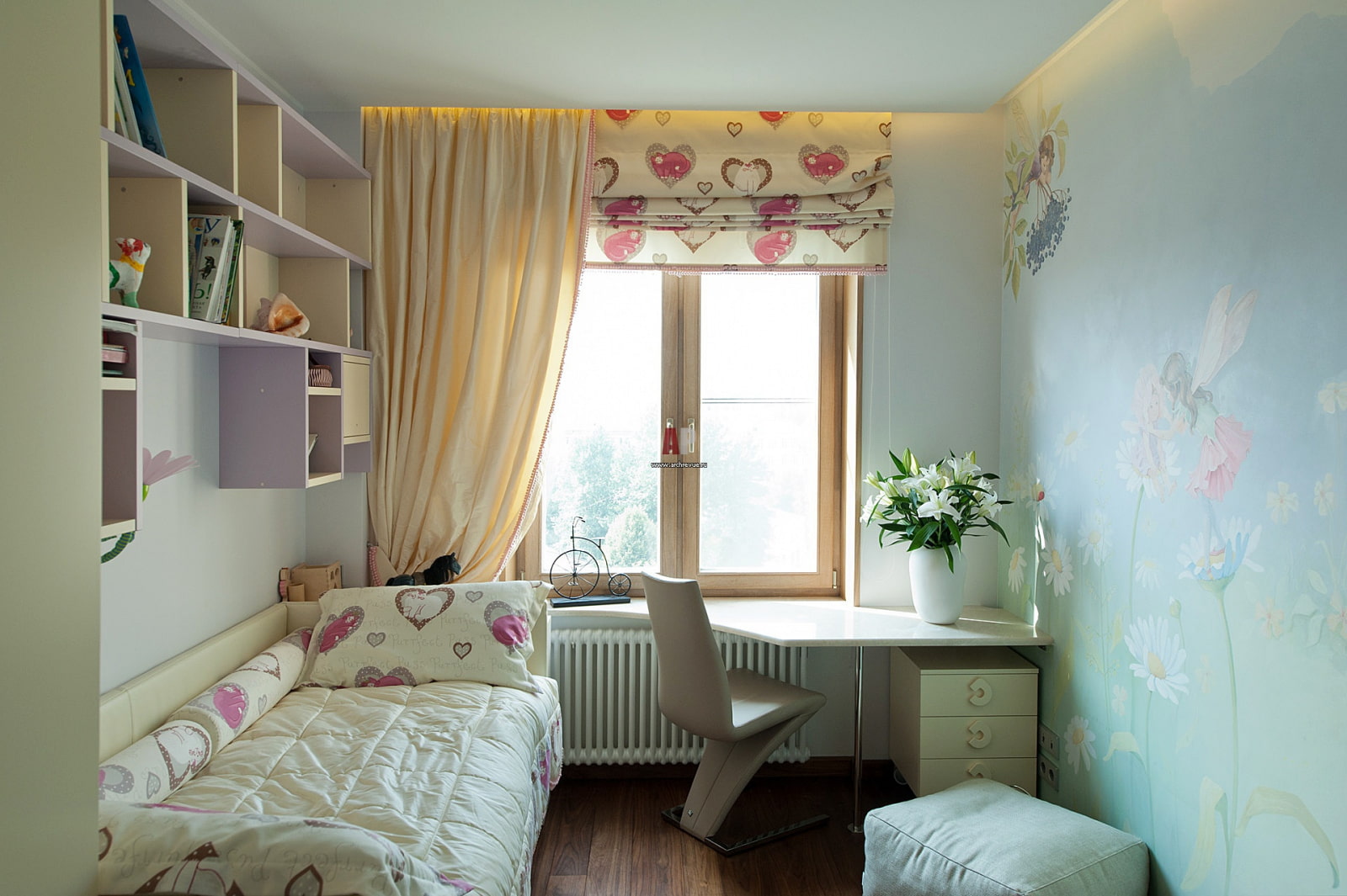 In the photo there is a room in a Khrushchev building for a teenager. Roman blinds look laconic and do not interfere with the table placed near the window.