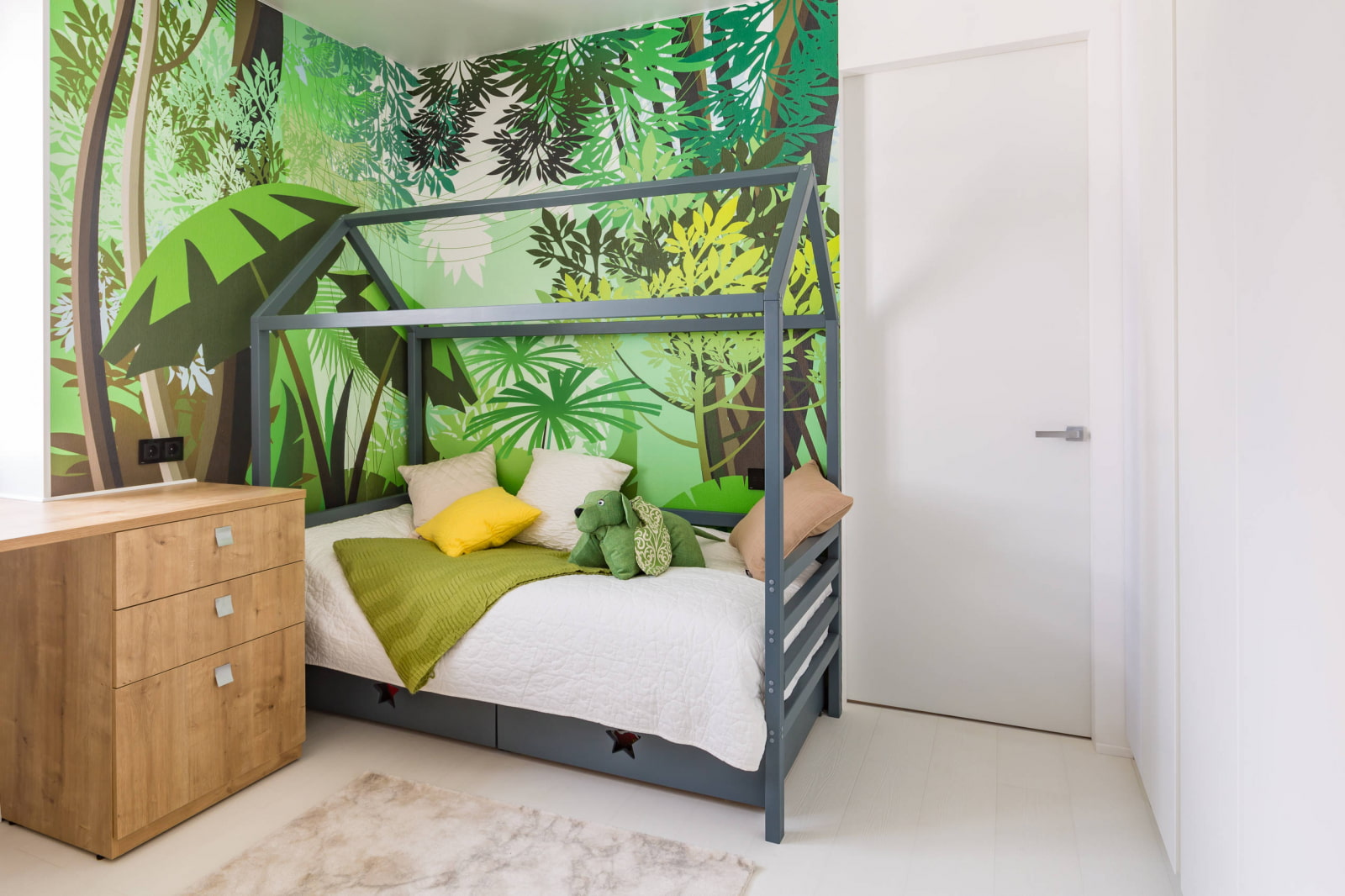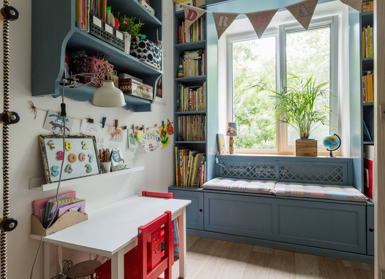 This age is distinguished by active knowledge of the world. Furniture should not have sharp corners, and materials for decoration are chosen as natural as possible. In the play area, you can equip a house or hut, cover the wall with slate paint, lay a soft rug on the floor, and make the shelves long enough to arrange books with covers up.