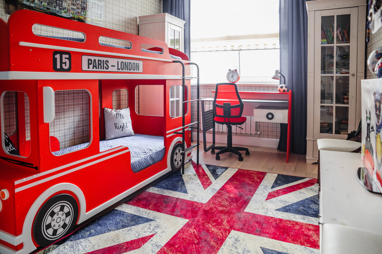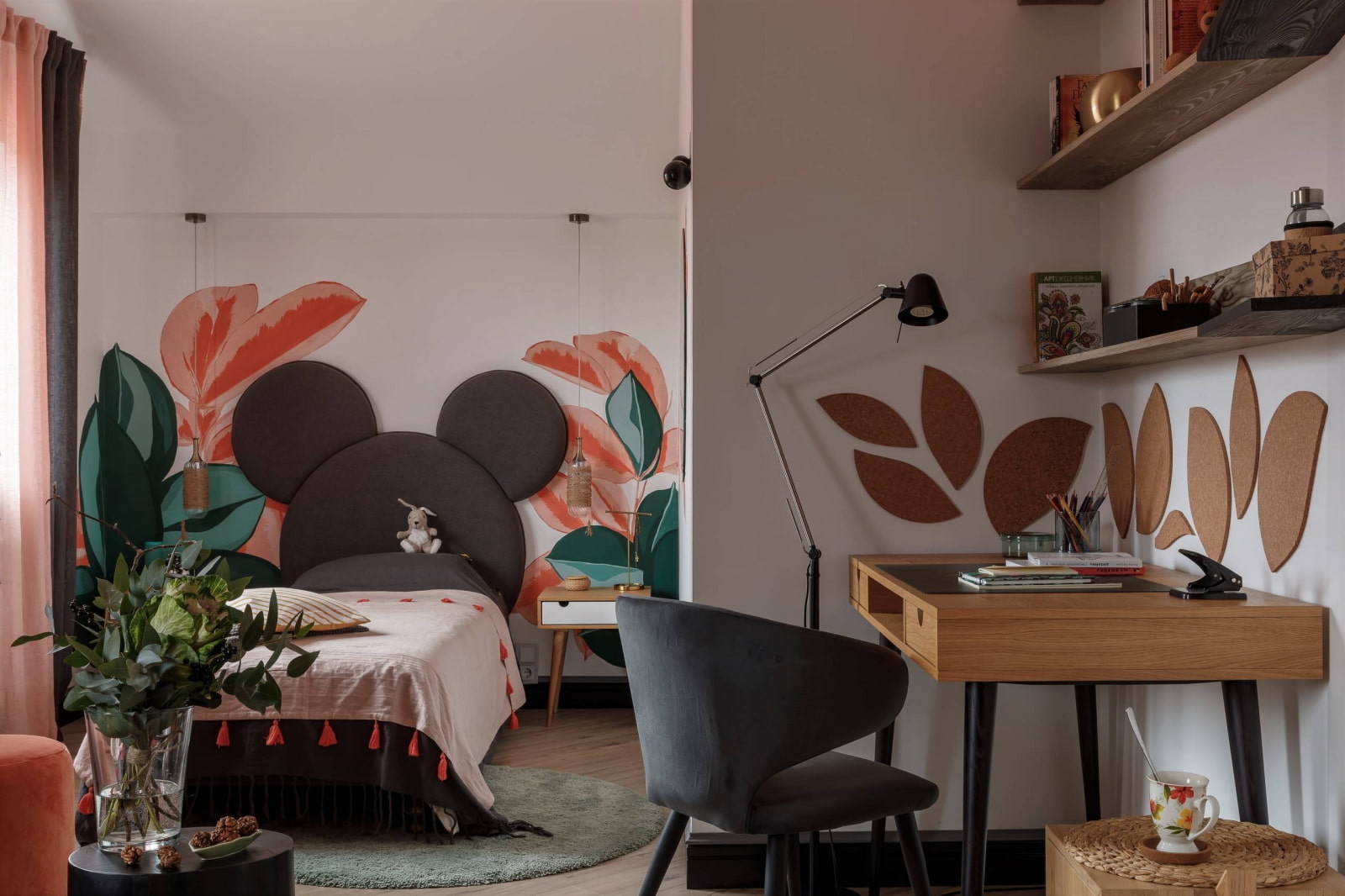 Furniture can also be a bright spot in a child's room. For example, a bed in the shape of a car or a headboard in the shape of a Mickey Mouse head. A soft chair with bunny ears, a pouf in the shape of a cat or a bear is not only a comfortable seat, but also a wonderful toy. Cabinet furniture can also be unusual - a house shelf or a pencil case in the form of a rocket will become a highlight of the interior.