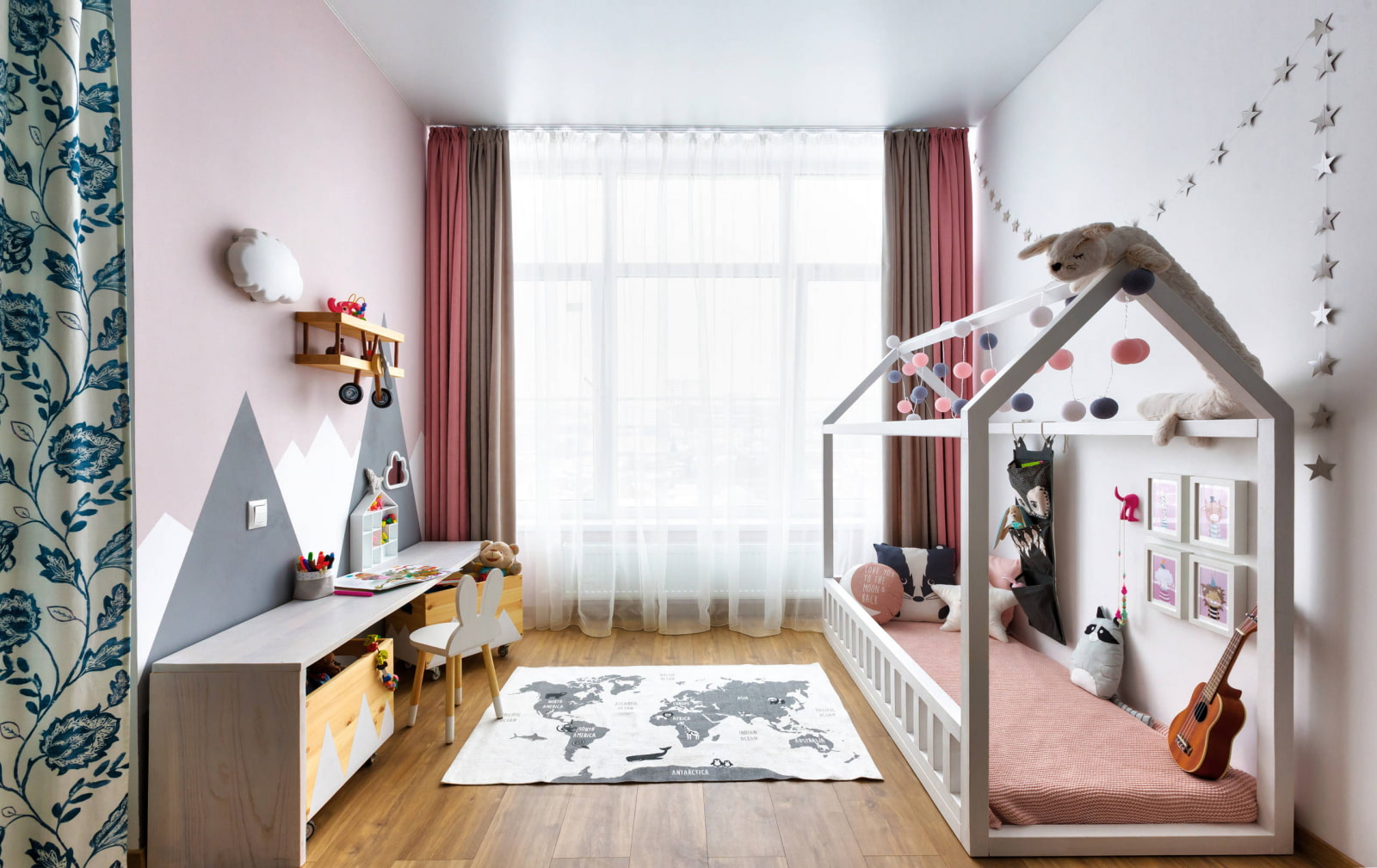 In the photo there is a bedroom for a preschool girl, designed in a modern style.