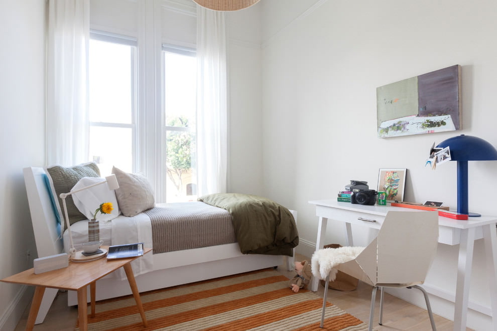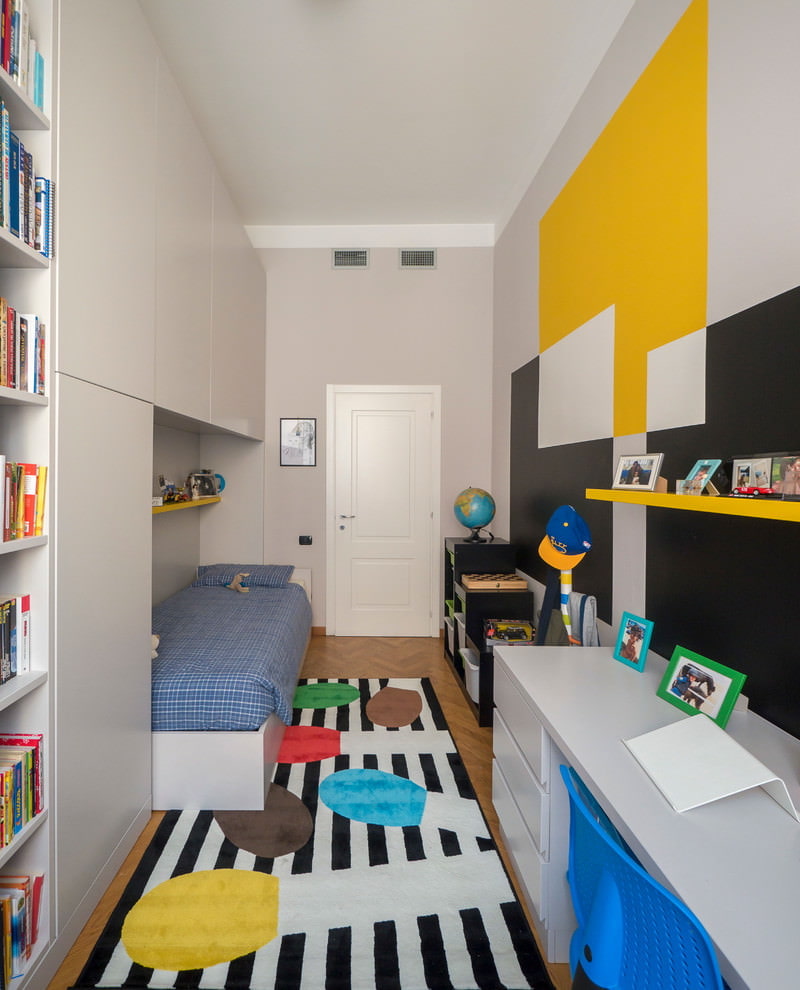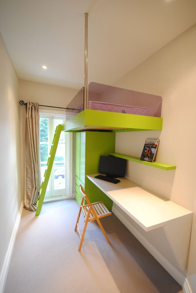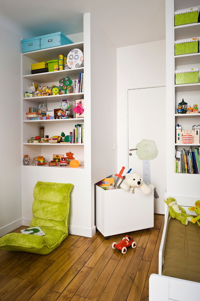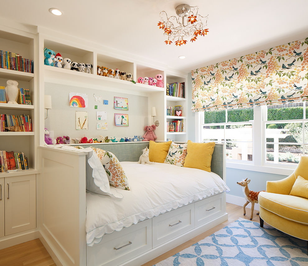 It is better to choose a bed for growth, of the usual adult size, and organize a second floor for it for games or storage. The bed can also be a chest of drawers, which has pull-out shelves at the bottom. A pull-out bed, an armchair-bed, a folding sofa will also save space in a small nursery.