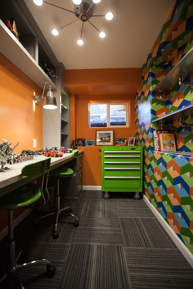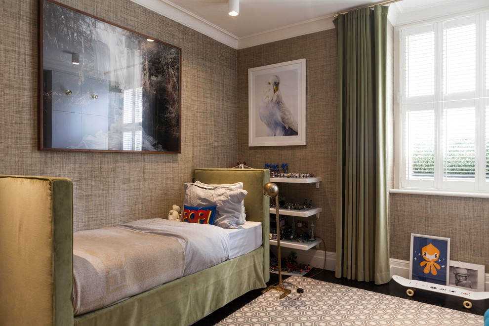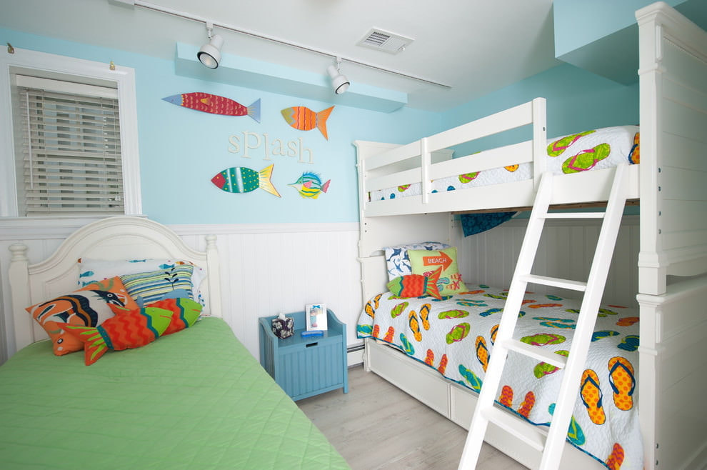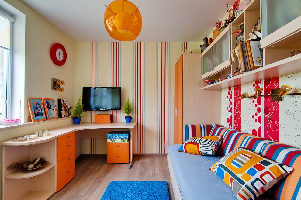 - Light color palette (pastel wallpaper with or without a pattern, glossy white ceiling, do not use more than three colors to create an interior). Bright accents are appropriate for children under 7 years old and more muted after 9 years old.