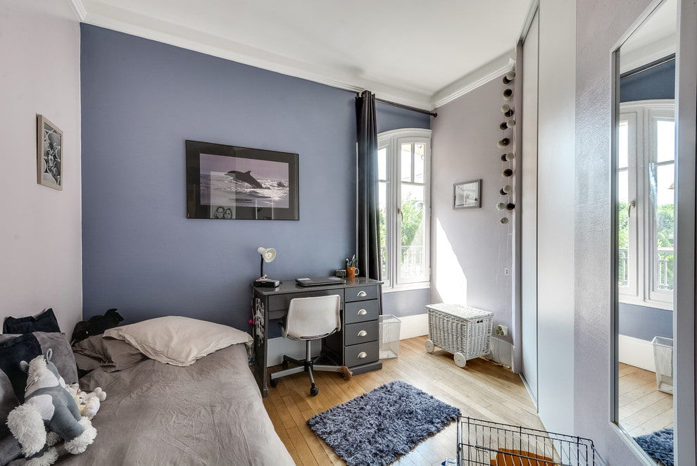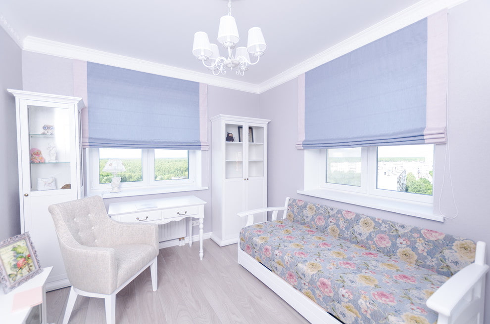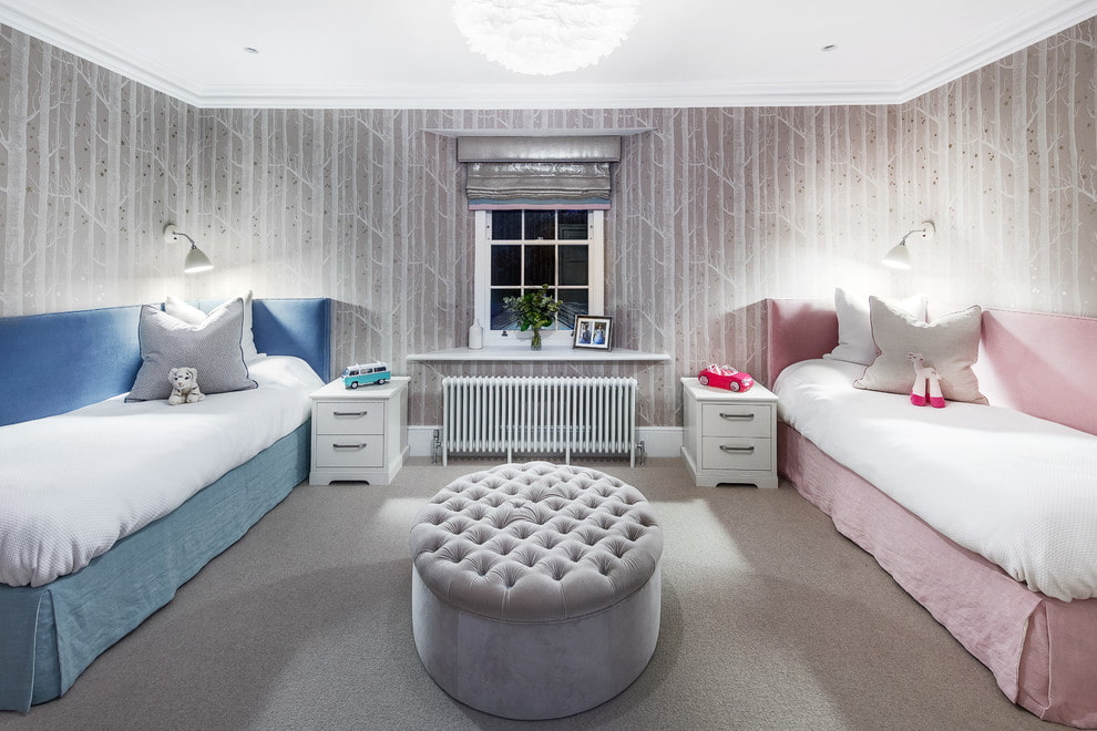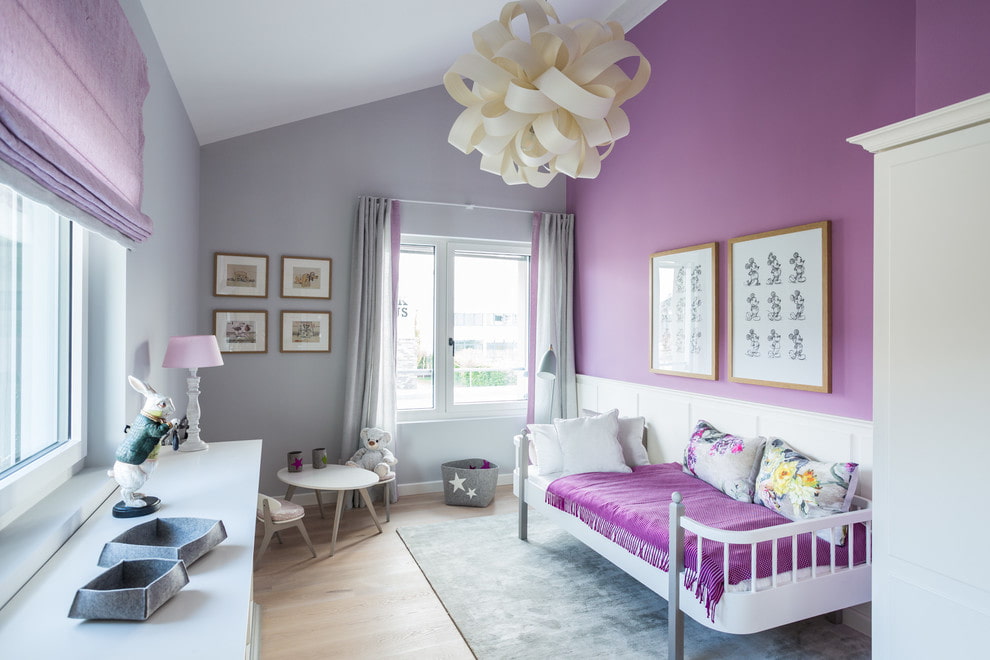 Two not too saturated and catchy colors, smoothly flowing into each other, perfectly act as a basic interior background. This design gives the children's room a balanced, restrained and at the same time presentable look.