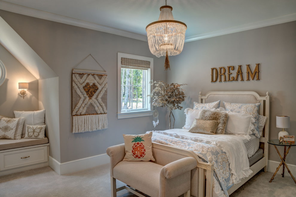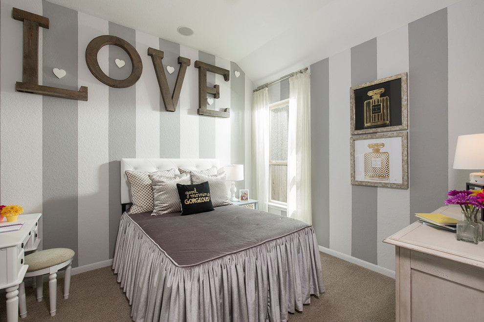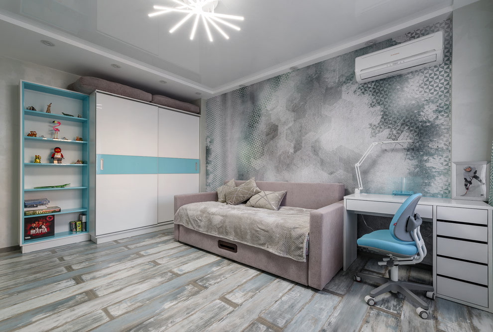The photo shows a combination of slate and beige colors in the interior of a teenager's bedroom.