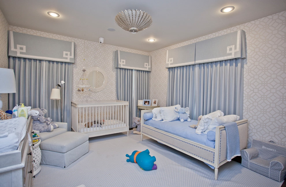 The photo shows the design of the boy's nursery, decorated in gray-blue tones.