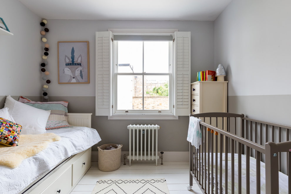 The photo shows the interior of the nursery with finishing in white and gray colors.
