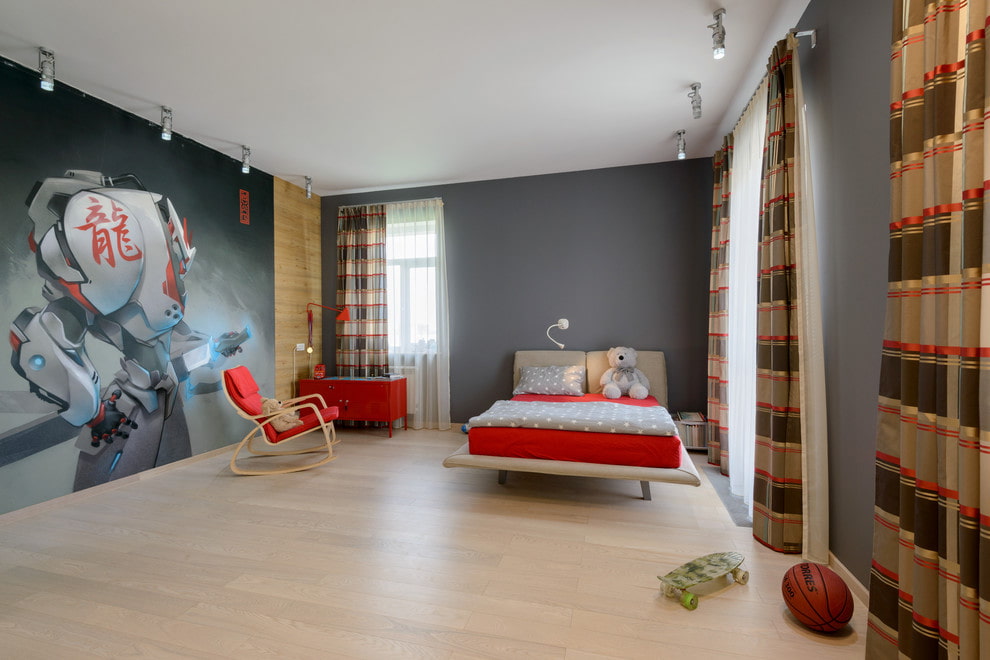 In the design of a gray room for a teenager, bold, creative and contrasting combinations are allowed. For a young man's bedroom, a black-white-gray scale with the addition of red accents is suitable, and the interior for a girl can be done in gray, yellow or golden shades.
