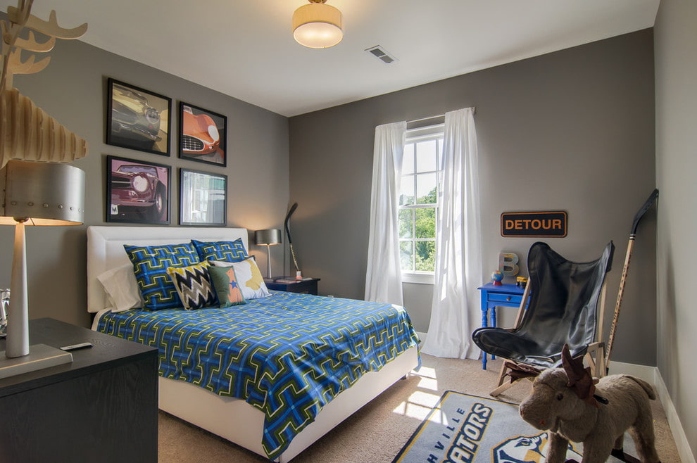 As bright spots, you can pick up elements in the form of curtains, a headboard, a soft ottoman, an armchair or a sofa, a bedside rug and a table lamp in the work area. You should not add a large number of accents to the room so that, in combination with colorful toys, books, drawings and other little things, they do not visually overload the space.