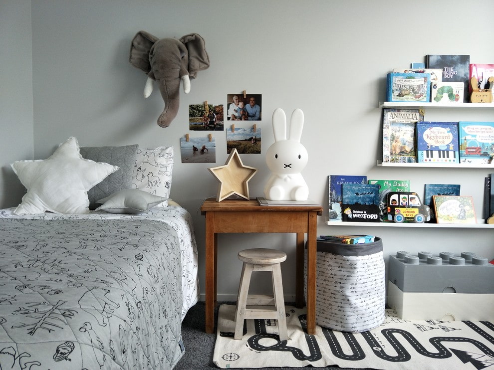 The photo shows turquoise accents in the interior of a light gray children's room for a girl.