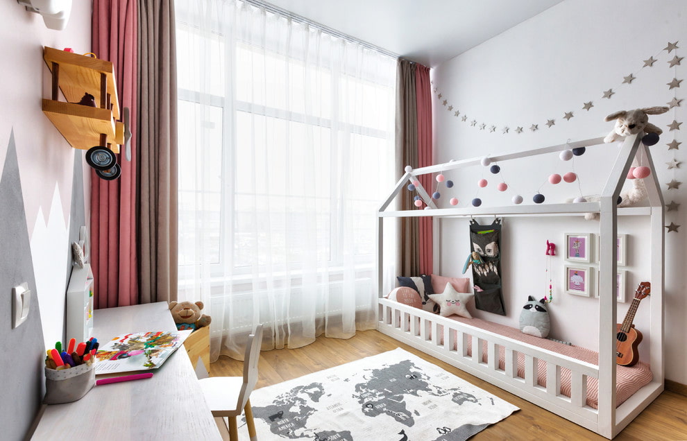 The bed-house is decorated with a wide variety of decor, for example, it can be a canopy or a canopy, which will provide an opportunity to change them, creating a new mood in the interior every time and will not only be a decoration, but will also allow you to adjust the level of illumination during daytime sleep and protect against drafts.