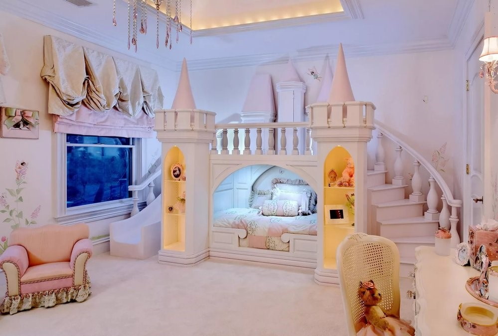 Beds in the form of a small tower with a chimney on the roof, a fairytale castle, a palace, a doll or caramel house decorated with carved railings, interior lighting, or shelves will also be appropriate here.