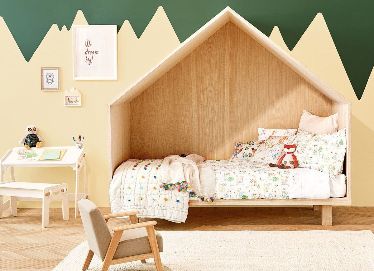 In the photo there is a single wigwam bed in the interior of a nursery for a boy.