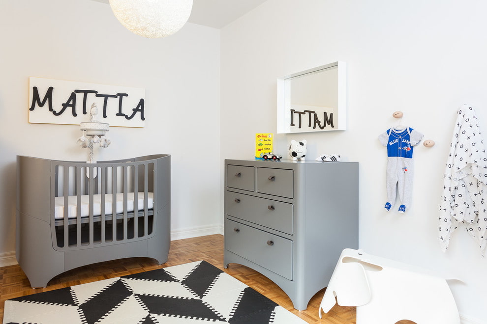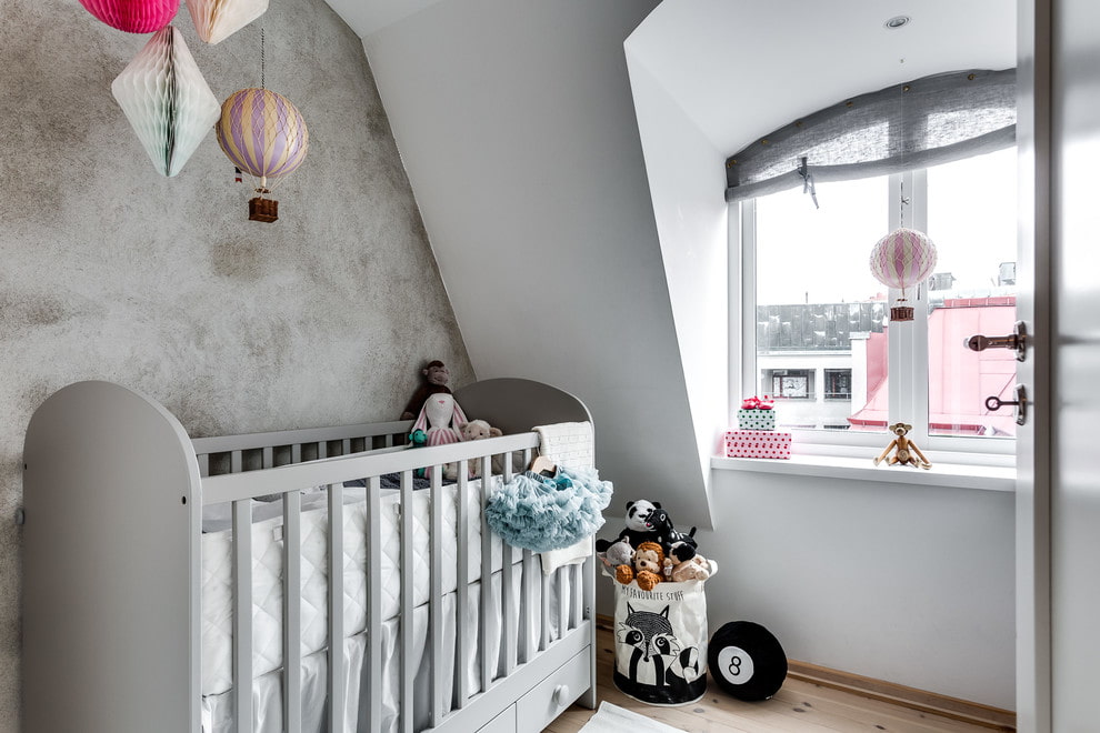 The photo shows a gray bed in a Scandinavian-style newborn's room.