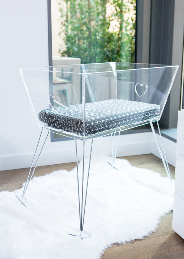 In the photo there is an unusual design of a transparent crib for a newborn, made of acrylic.