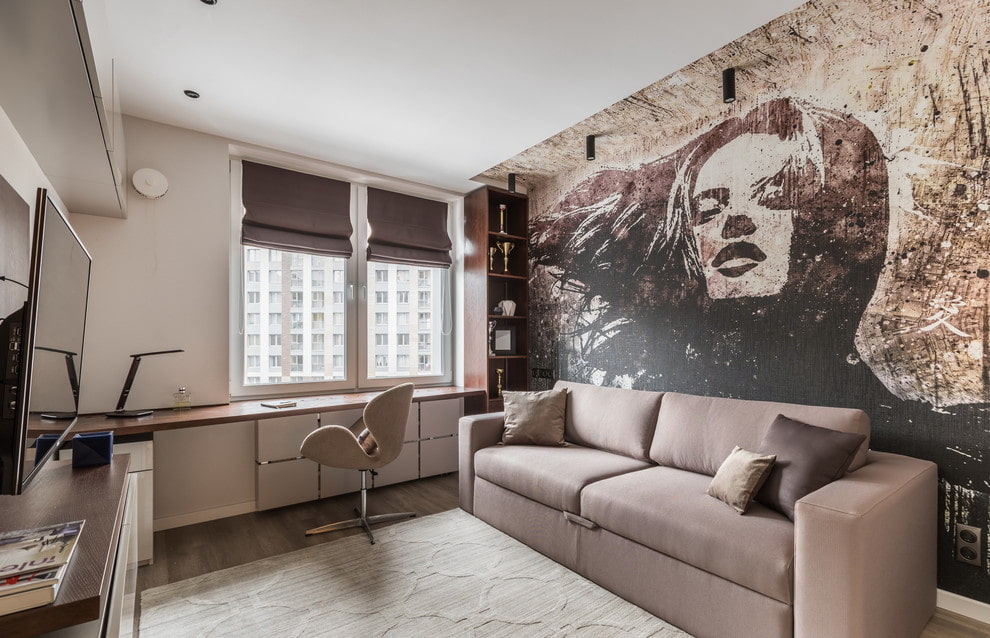 Teenagers often choose their hobbies, which they devote a lot of free time to. Heroes of your favorite TV series or movies can decorate the wall on the photo wallpaper. In addition to heroes, these can be plots of computer games or episodes of films.