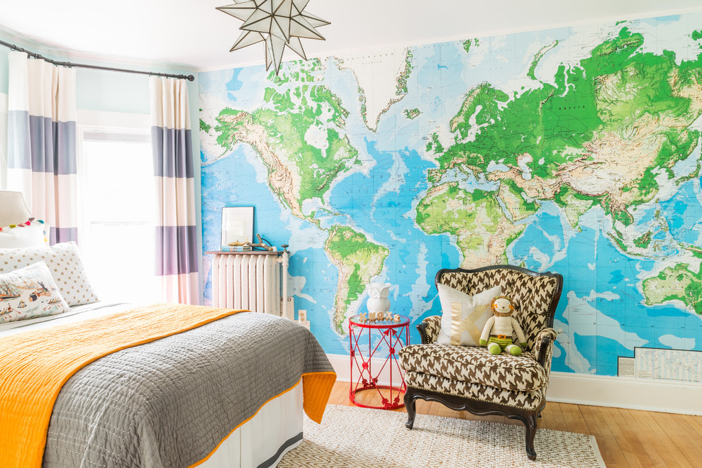 A map of the world, the starry sky or a fabulous pirate drawn map is suitable for decorating the room of a throwing and inquisitive teenager. Depending on the way the map looks, the drawing can correspond to different stylistic directions.