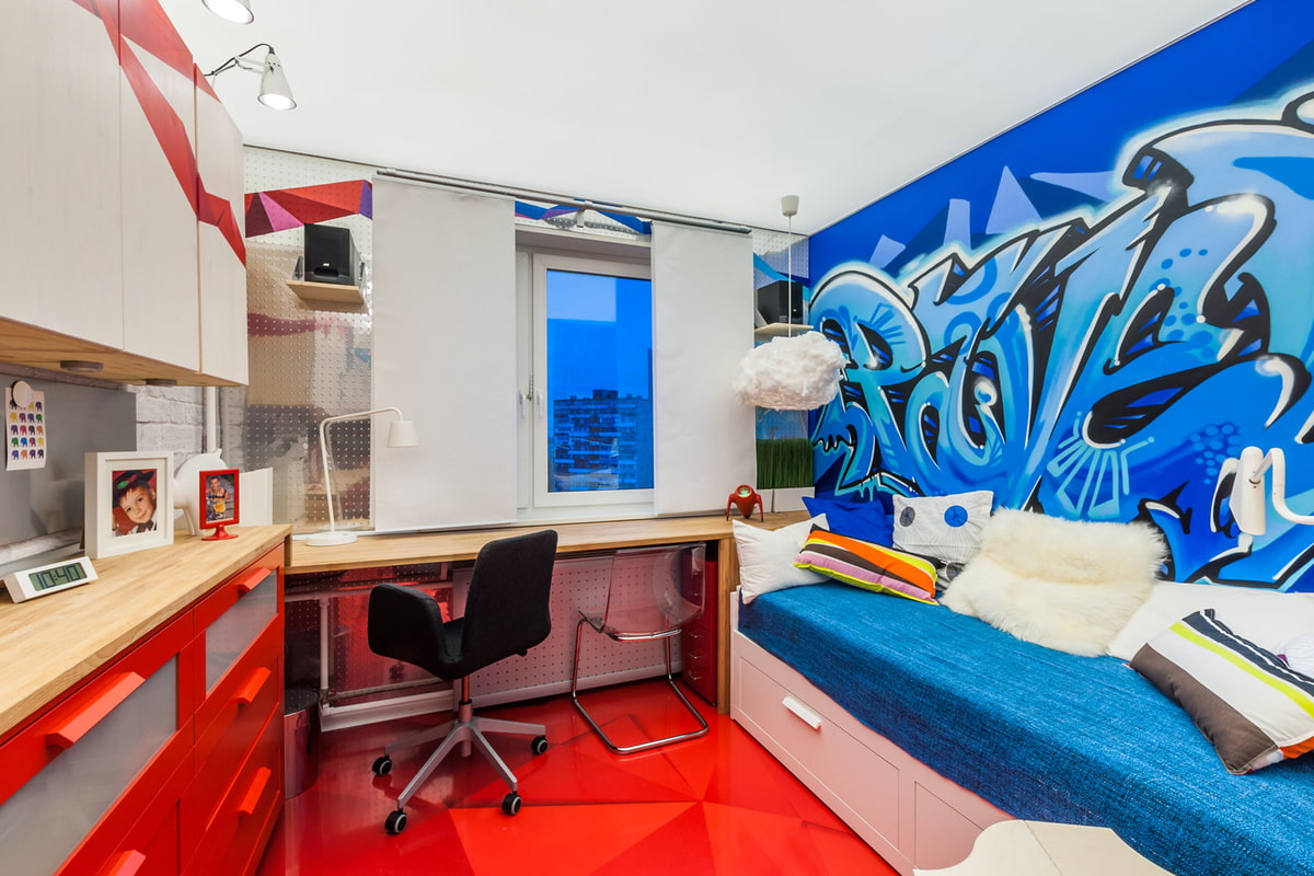 On the picture room for a young man in a modern style with bright blue graffiti on the accent wall.