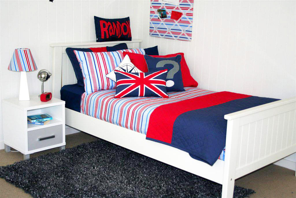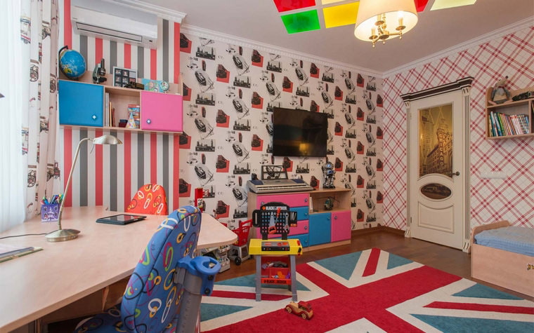 Registration nursery in English style impossible without the use of the national flag design. It can be found on fabrics, in wallpaper, or as a poster on the wall. The colors of the UK flag work well together and are easy to use in interior design.