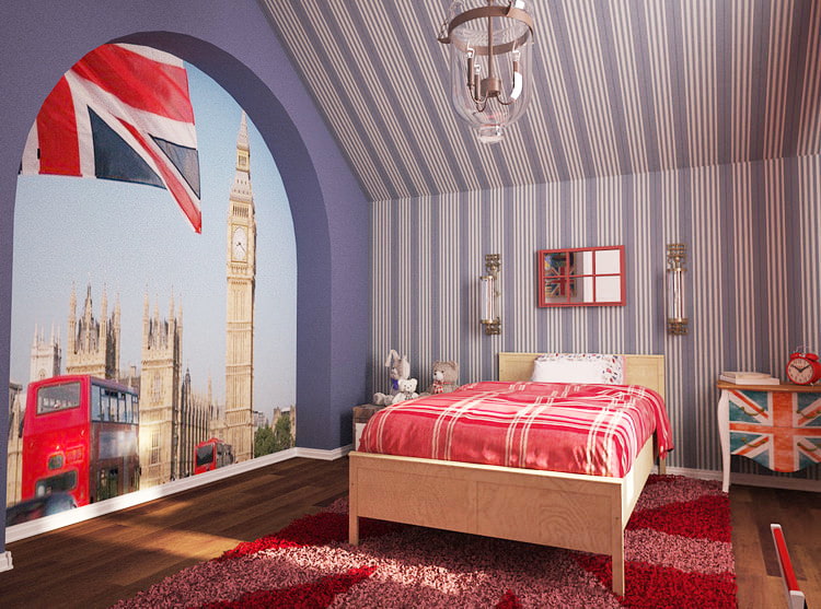 Using printing on fabric, you can transfer any English landmark there and nursery in London style will not be like the others. She will not only provide the child with all the opportunities for a comfortable life and the development of his abilities, but also help to reveal his individuality.