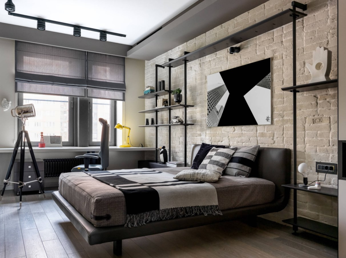 When designing a room for a student, take into account the need for a work area from the very beginning, entering into the design. For example, in the project shown below, the table, bed, wardrobes, shelves are assembled into a harmonious one-piece combination.